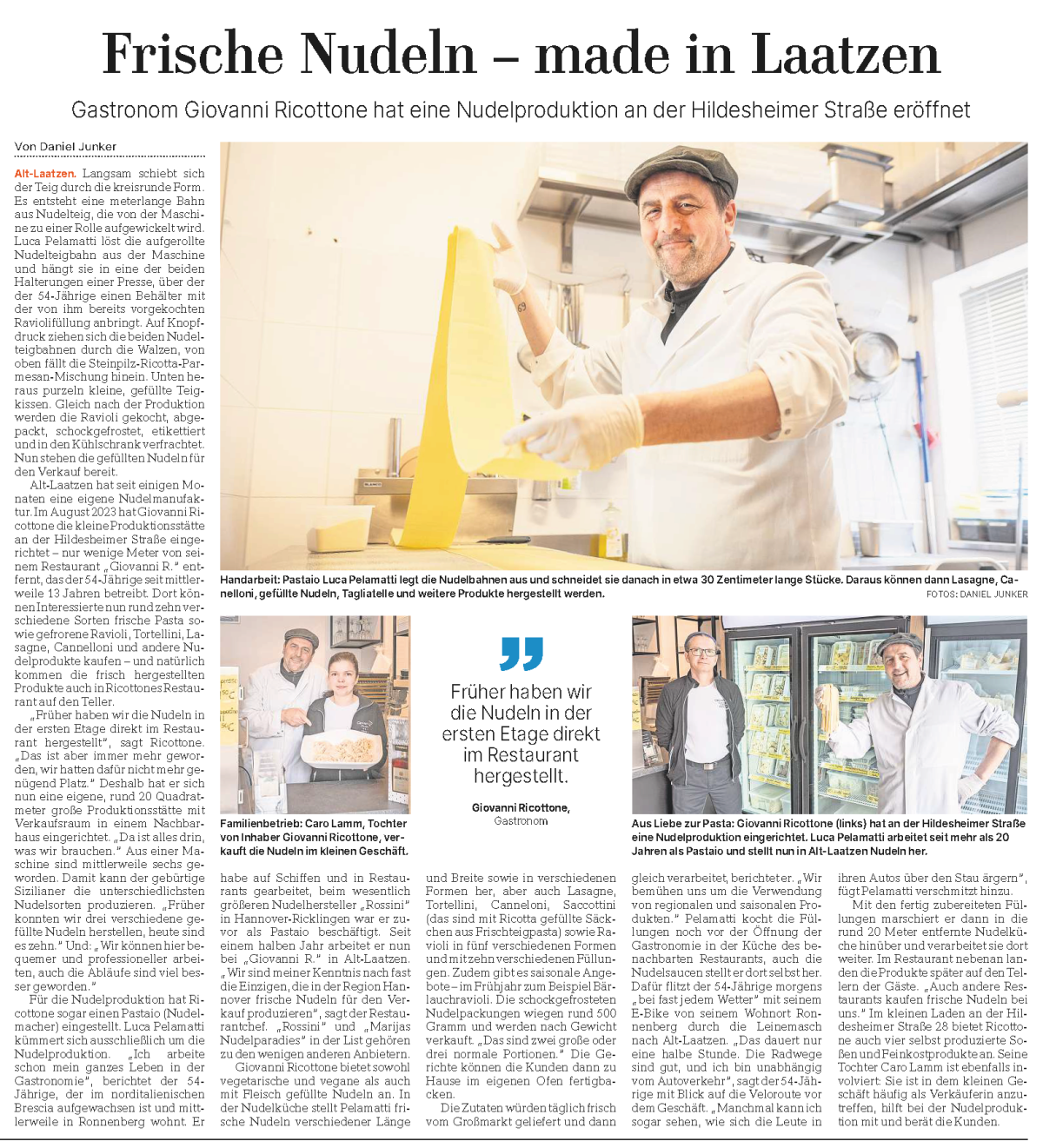 Giovanni R ihr familiengeführtes italienisches Restaurant in Laatzen, Nähe Hannover Messe, Expo Plaza & ZAG Arena, mit eigener Nudelproduktion, Pastaproduktion, Produktion, Manufaktur, Italiener, italienisch, Hildesheimer Str. 30, Pizza, Nudeln, Pizzeria, Bringdienst, Essen, zum Mitnehmen, Spezialitäten, in der Nähe, Fisch, Fleisch, Steak, ZAG Arena, Giovannis, Trattoria, Nudelmanufaktur, Wein, Weinstube, Lieferservice, Giovanni Ricottone,